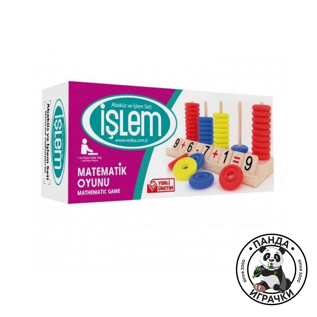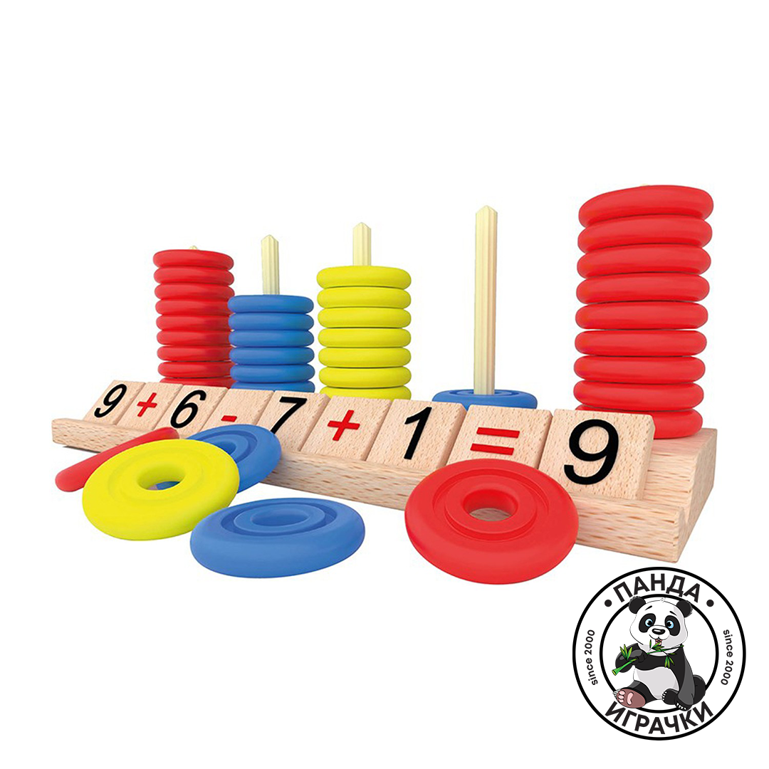 Дрвена игра со кругчиња и броеви за совладување на различни математички задачи.