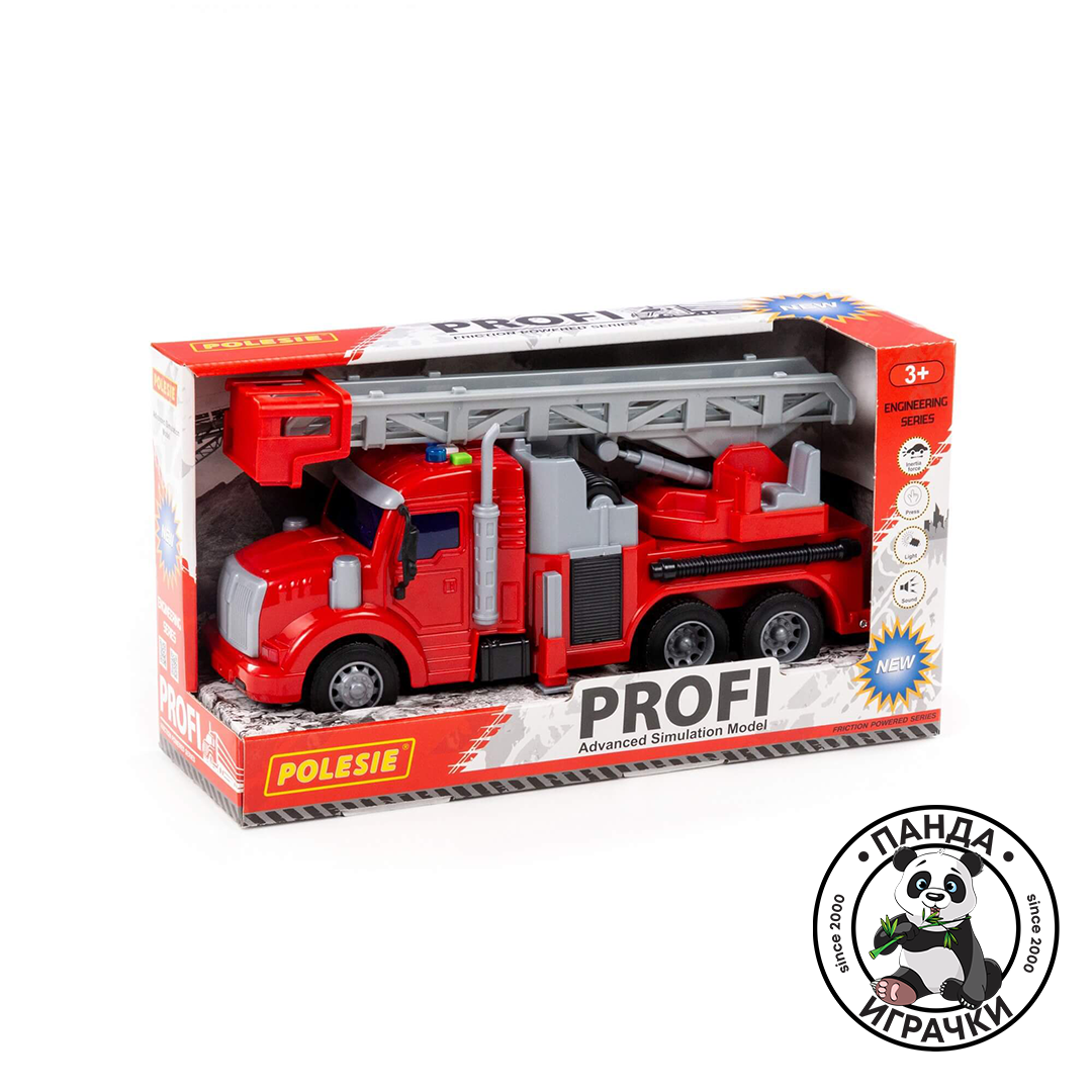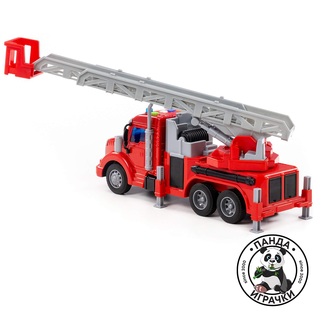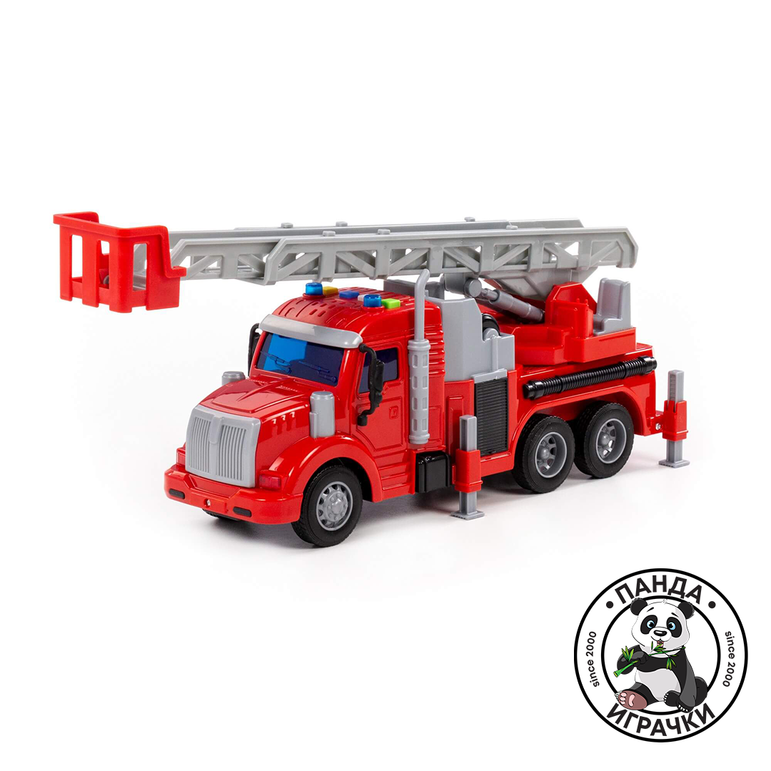 Пожарна со звуци и скали кои се пуштаат. Димензиите на камионот се 31x10x15цм со собрани скали.